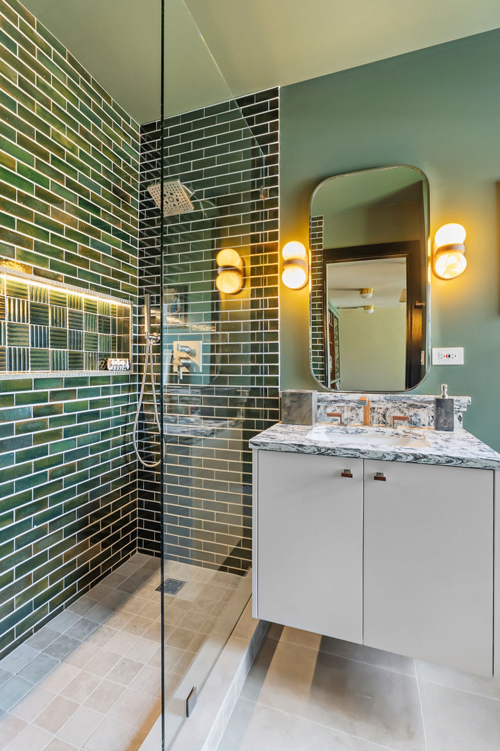 Markoutsas makes another interesting design point when he says, “A backlit horizontal application can make a home feel playful. But when you do it as a vertical application, all of a sudden, it has a different feel. And if it’s done right … it makes a space feel very elevated, very sophisticated. And that’s what we were going for.” The homeowner agreed that it was a brilliant way to use the stone and light the shower.