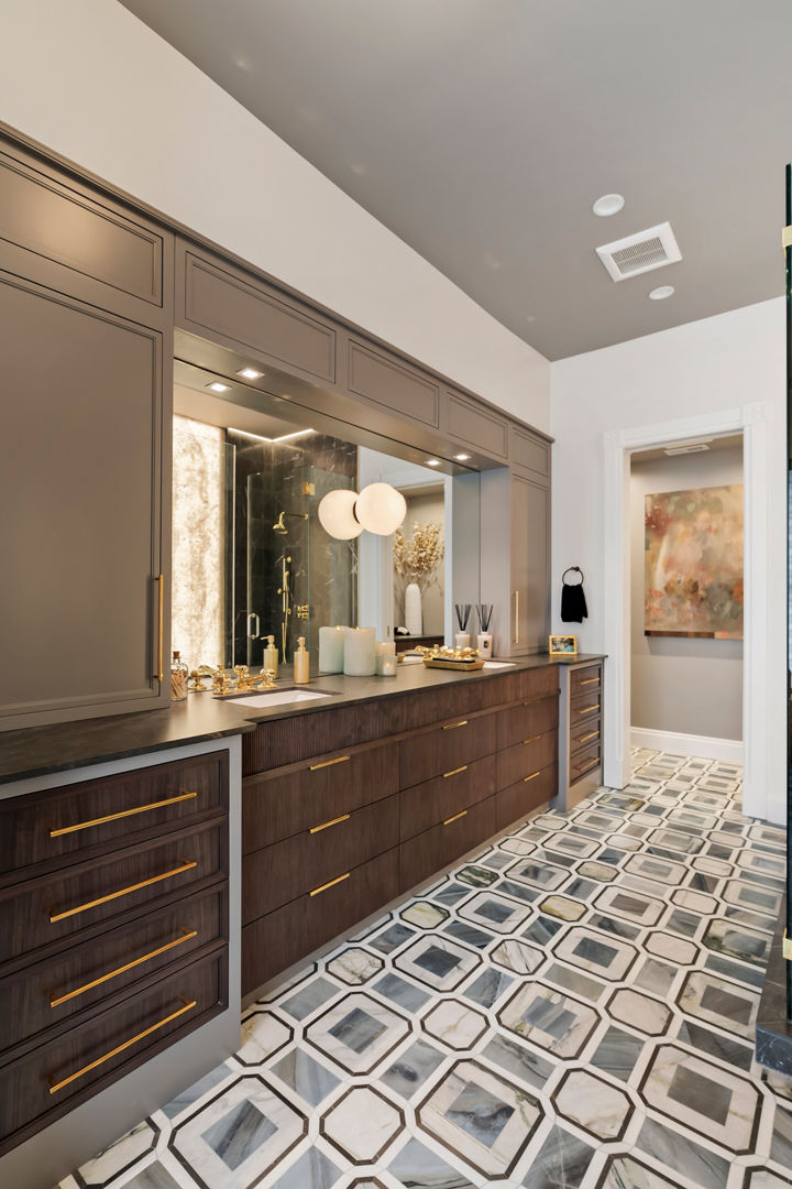 The design of the primary bathroom started with the flooring. Markoutsas describes the elegant floor tile, with its unique colorways and geometric shapes, as a “must have” for this historic estate. Most other materials were selected to complement the masculine energy of the tile design along with layers of softer design elements that harmonize rather than compete with each other.