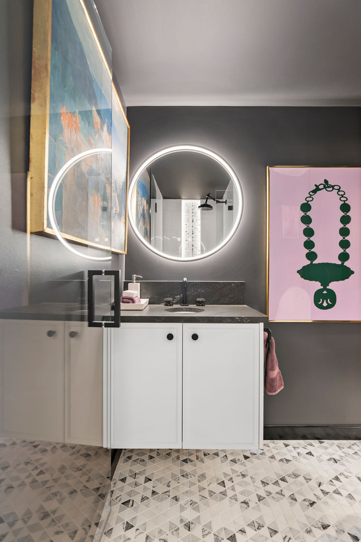 The three other bathrooms designed by Ablaze in the Lake Forest Showhouse use Cambria quartz surfaces for the vanity tops. The stylized results showcase the firm’s overall design prowess. Markoutsas says, “We were able to get creative and speak a design language that is reflective of a show house.” Taken together, this collection of en suite bathrooms are like arrangements within a symphony.