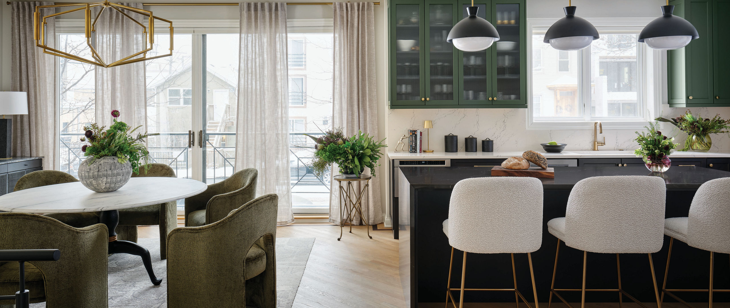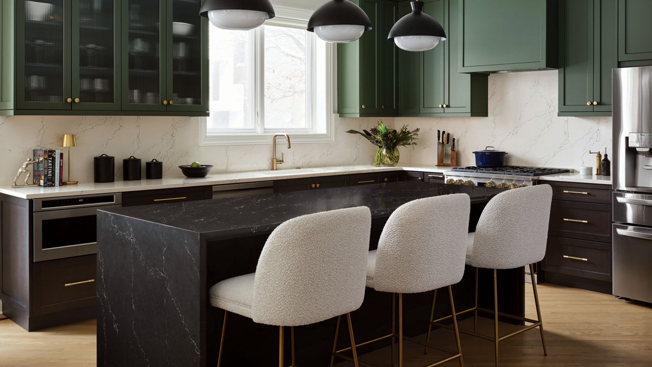 We spoke to Cambria Style featured designer Mark Schubert of M2 Design Lab about how he transformed a Chicago kitchen and dining area with panache. In this expanded look at that conversation, he explains more about what led him and his clients to decisions that include a bold green color for their upper cabinets and contrasting Cambria designs on the countertop and island.