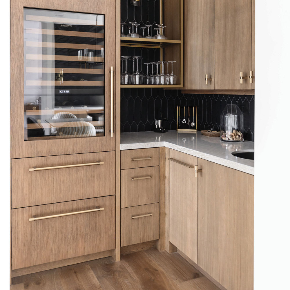 She balanced the expanses of wood with bright white walls and surfaces, including Cambria Ironsbridge quartz design on the kitchen counters and a plaster finish on the large custom range hood. Repeating black and gold accents in every room—even in the surprisingly elegant pantry—turned up the style quotient and created a sense of coherence throughout the house.