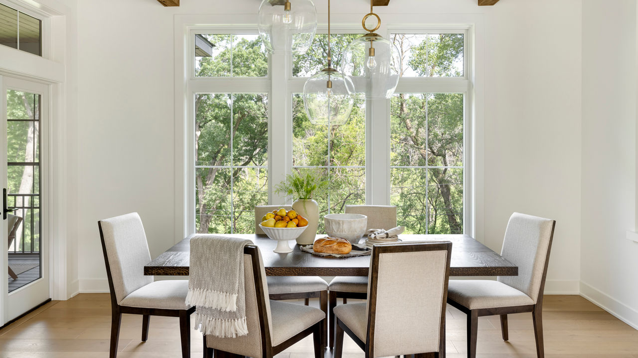 As we journey into the dining room, an area that feels connected yet distinct, this home opts for intimacy over sprawling expansiveness. Wynia challenged convention by hanging three pendant lights at random heights over the dining table, creating an organic, sculptural focal point that doesn’t block any views. And note the complementary transoms above the dining room windows and the adjoining patio doors.