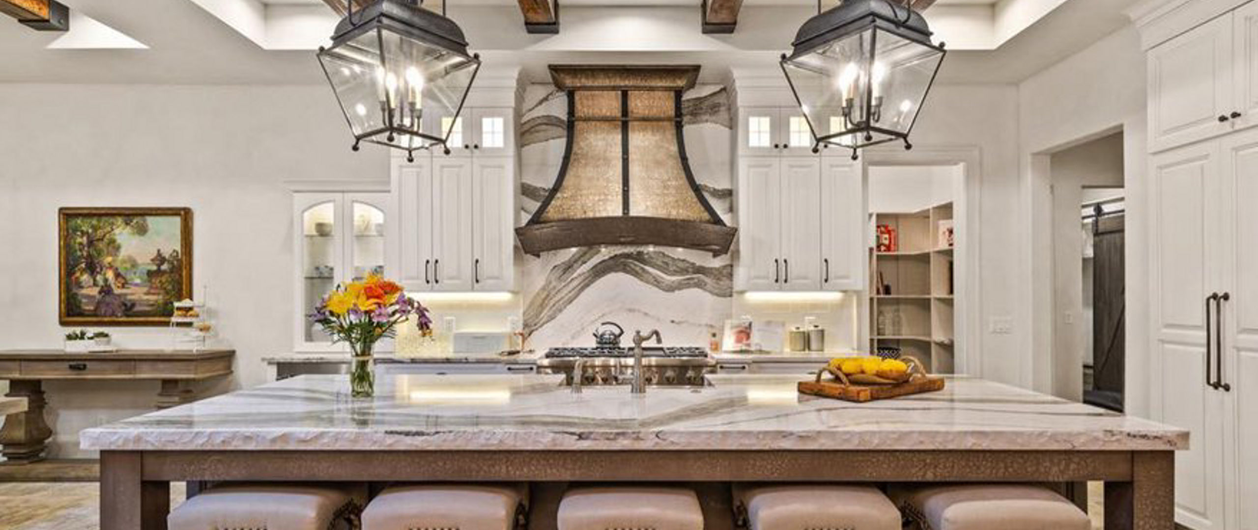 Skara Brae™ quartz countertops with a Moraine edge lend old-world character and rustic texture to this luxury kitchen. Kitchen design by Kitchen Design Group and interior design by Doni Flanigan for Justin Doyle Homes.