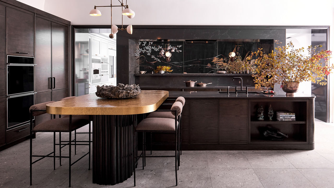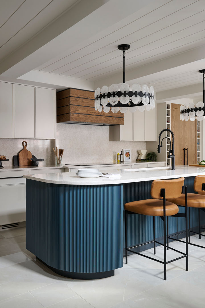 Soft curves are endlessly elegant, and a rounded or pill-shaped kitchen island brings a sense of sophistication. And in a sleek modern kitchen with minimalist cabinetry, matte finishes, and statement lighting, a curved island softens the geometry. It introduces a sense of fluidity that tempers the strong horizontal and vertical lines of modern design. A curved silhouette invites movement and conversation, encouraging guests to gather naturally around its edges. With no sharp corners to interrupt the flow, this island shape works beautifully in open-concept layouts or smaller kitchens where ease of circulation is key. The pill-shaped island feels luxurious yet approachable. It’s an ideal choice for those who value both aesthetics and atmosphere. It’s a design that balances functionality with a gentle sense of calm.