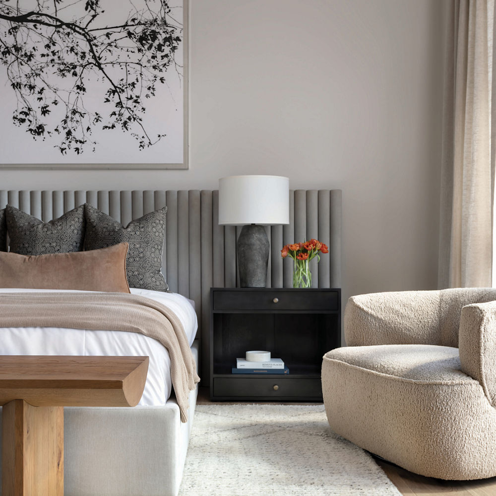 A serene palette of crisp whites, neutral tones, and wood accents defines the primary suite.