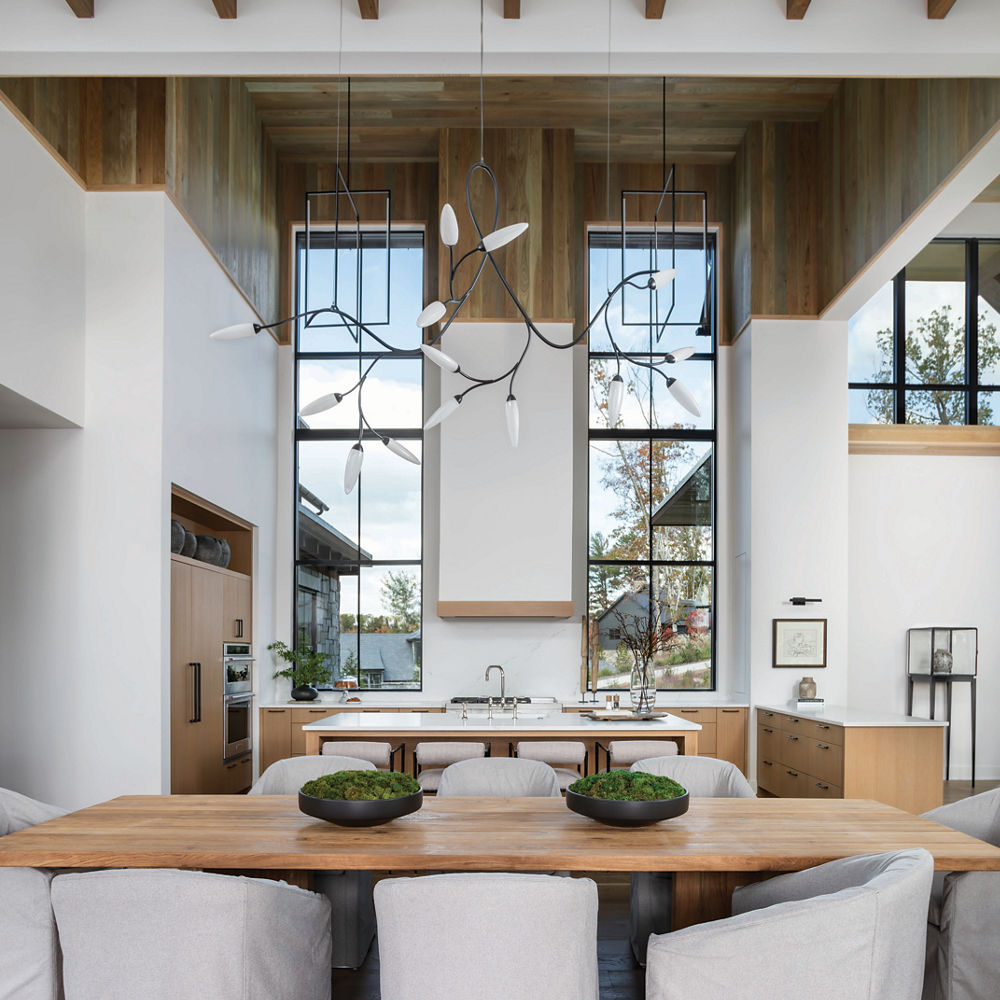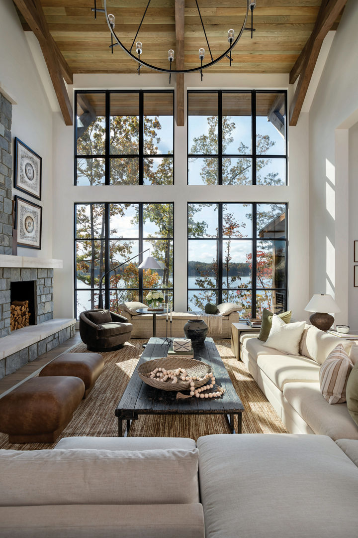 Expansive windows frame picturesque lake views in the great room, where organic textures like wood and stone and a soft, neutral palette echo the natural surroundings.