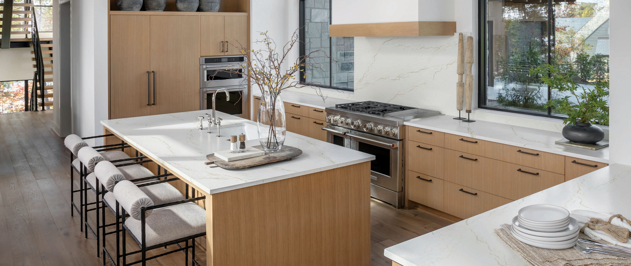 As a nice complement to the natural wood tones, Cambria’s Inverness Frost quartz countertops in a matte finish offer crisp contrast and brightness. “It was important to select materials that were carefree and easy to maintain,” Ramsey explains. “Quartz was the logical choice for the countertops, and because of the extensive styles they offer in matte finish, we were able to get the right look with an organic feel.”