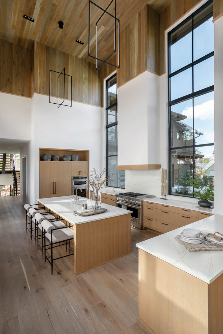 Specifically in the kitchen, Ramsey deftly employed smart design solutions to enhance the harmony of the home. “The kitchen was voluminous with a really high ceiling,” Ramsey explains. “I kept looking at the architectural drawings, and it just felt like a huge white box. So, we decided to cap the ceiling and a portion of the upper wall with wood to add warmth and break up the height, so it wasn’t just this soaring white ceiling. I feel like it’s made a big difference.”