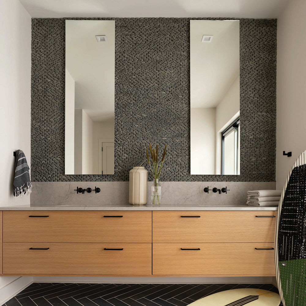 “The architecture is very inspiring—the way that it brings the outside in and is really situated in the trees with gorgeous water views,” says Ramsey. “Even though the lines of the house are very modern, all of the finishes and materials we chose were purposefully organic, natural, and earthy in tone to connect with nature.”