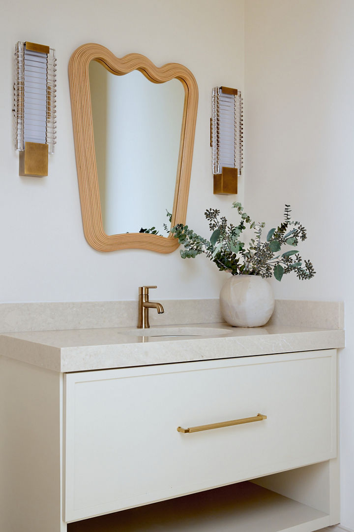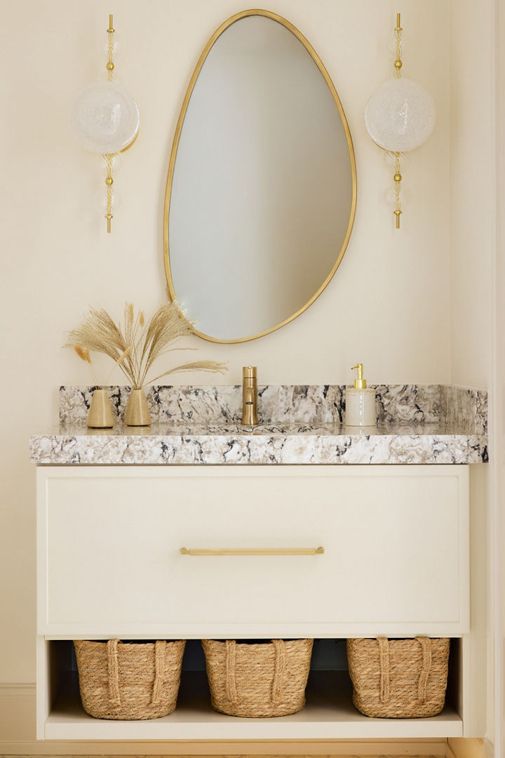 Kelly deviated from her love of Hermitage in a bathroom where she topped a floating vanity with a 2½-inch-thick mitered countertop in Cambria’s MonTaaj™ design. She says, “MonTaaj may be my second favorite Cambria design because it’s also beige, and because it’s probably the closest I’ve seen any quartz surface come to Taj Mahal quartzite,” a stone beloved for its beauty but that is less durable than Cambria natural quartz surfaces.