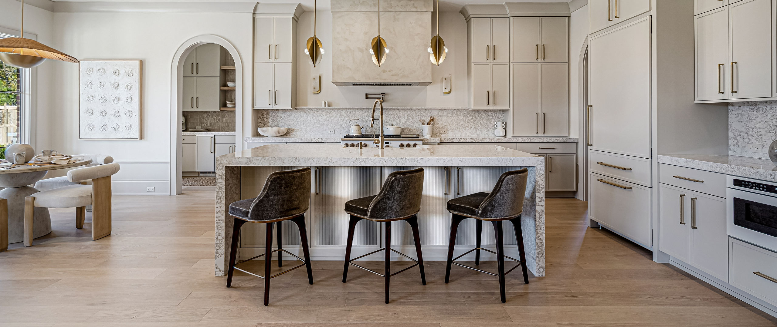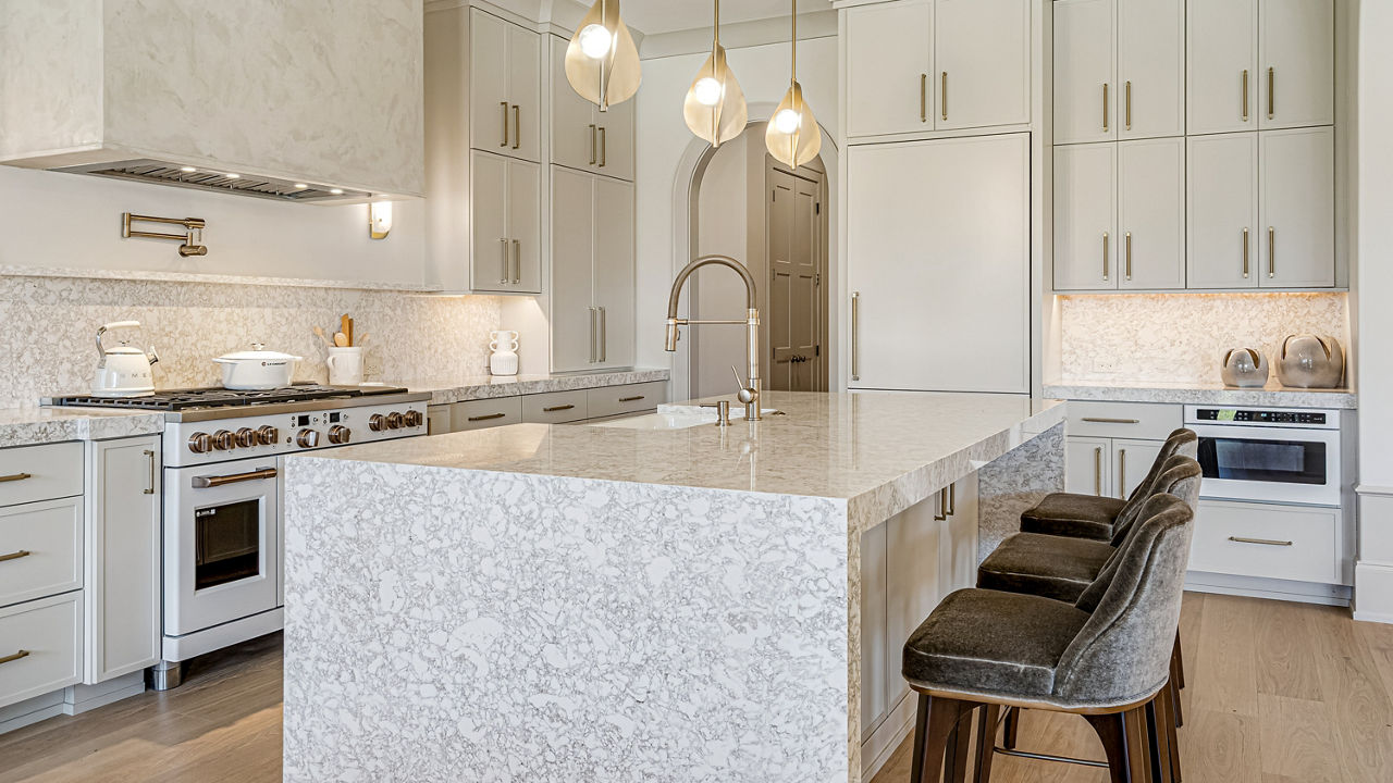 As for Kelly’s specific countertop selection for this home, she prefers Cambria natural quartz designs like Hermitage that feature swirls in tight and open patterns, creating lighter and darker pools of color. She says, “It portrays more of a marble or granite look,” for the kitchen countertops and waterfall island that captivate in this space.