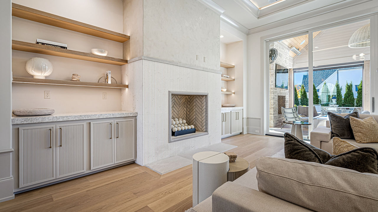 For cohesion, Kelly also used Hermitage quartz surfaces in the butler’s pantry, on a bar near the dining room, and on built-in shelving that flanks the living room fireplace. She says, “We talked about doing wood tops [on the built-ins], but the Hermitage helps round out the open concept by tying back to the kitchen countertops.”