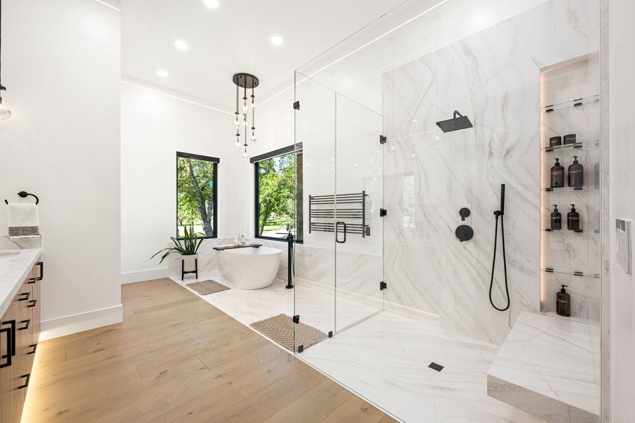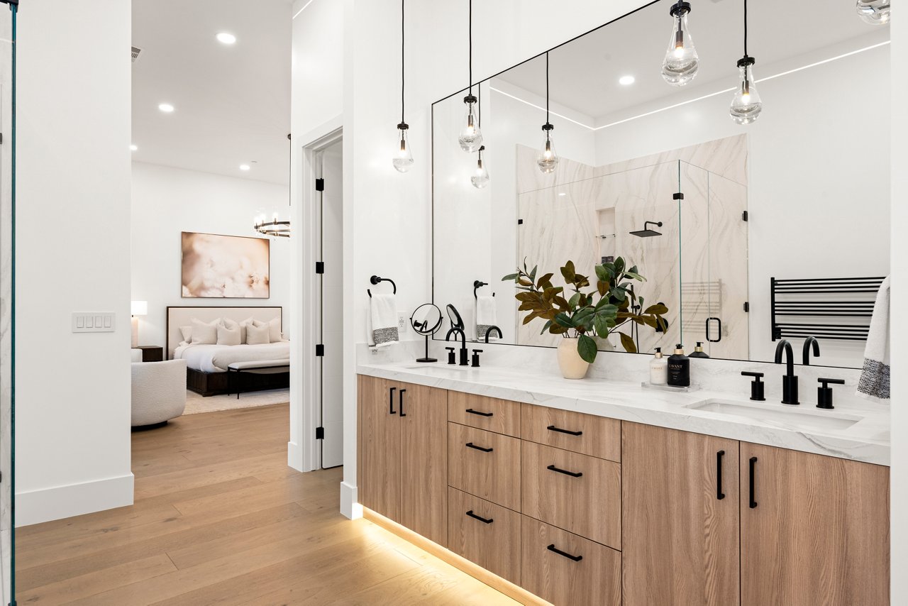 Lighting plays a subtle yet crucial role throughout. Vanities, stair treads, and millwork are illuminated with soft LED lines—creating dimension without distraction. Even transitions are intentional. Oversized sliding doors erase the boundaries between indoors and out, letting light, air, and nature views become part of the design. From a sculptural staircase to the curated placement of windows that frame garden views like art, no detail is overlooked.