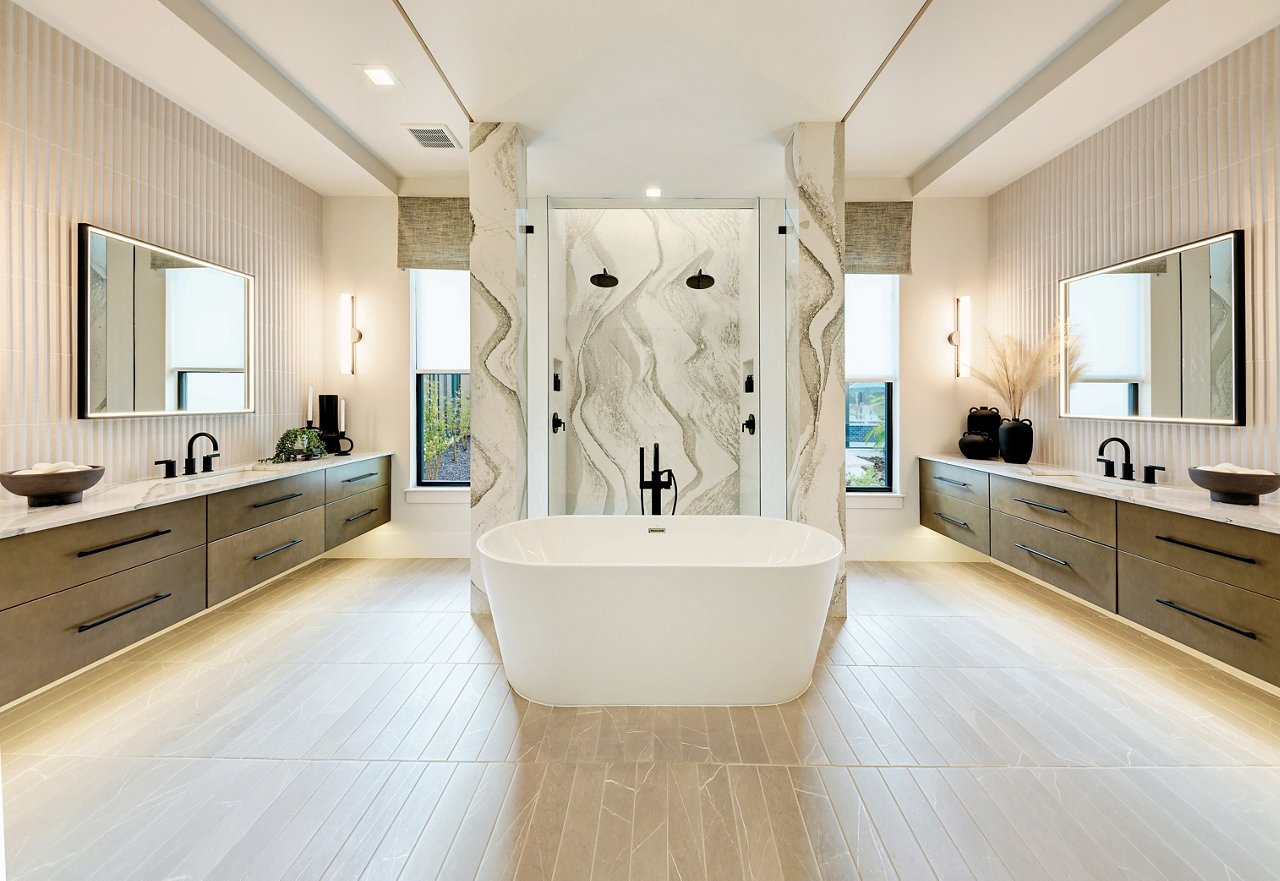 Nowhere is this more apparent than in the primary suite. The bathroom’s wet-room concept is a masterclass in luxury and innovation. Cambria’s Inverness Everleigh quartz design sweeps beneath and around a freestanding tub, enveloping the space with organic beauty. Inside the shower, Cambria continues—cladding niches, walls, and curbs in a material that’s not only visually stunning but inherently practical. “Cambria gives us the ability to create spa-level impact with zero grout lines,” says Gavrilyuk. “It’s clean, continuous, and deeply elegant.”