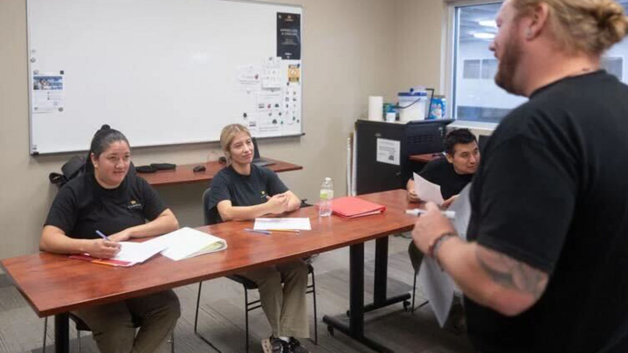 Classes are held in a dedicated learning space on-site, equipped with computers and technology that reflect real workplace tools. Students come from a range of backgrounds and Spanish, Taiwanese, Tagalog, and French are among the native languages represented.