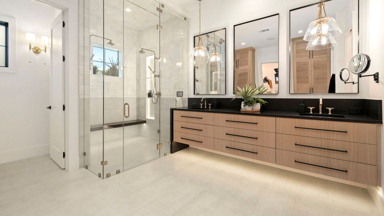 Lake Point: This modern farmhouse with old-world character blends warmth and refinement into every detail. The kitchen centers on a Delgatie™ waterfall island, balanced by Whitehall® on the perimeter counters. The design continues into the primary bath, cladding a hydrotherapy tub and extending into the shower as a quartz-clad bench. The result is a space that feels cohesive, timeless, and built to last.