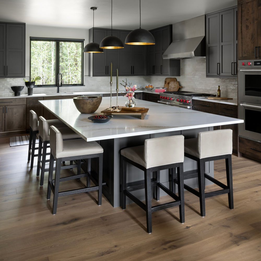Mountain Revival: A full-scale remodel for a returning client, Mountain Revival reimagined a previously closed-off home into a warm, highly functional retreat for a family of seven. The transformation centered on opening up the kitchen and introducing a dramatic oversized island finished in Brittanicca Gold Warm™. Chosen for its expansive size, the material allowed the design team to create a seamless, uninterrupted surface that anchors the space both visually and functionally.