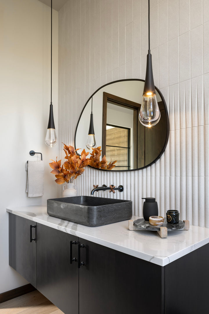 Frost Creek: This 7,200-square-foot ranch-style new construction home is tucked into the mountains of Eagle, CO. Designed as a highly livable retreat for a large, active family, the interiors prioritize comfort, durability, and ease. In the bright, neutral kitchen, Brittanicca Warm introduces soft veining that supports the home’s transitional aesthetic. In the powder bath, the same design creates a visual thread—this time paired with darker cabinetry, an asymmetrical mirror, and a raised vessel sink set atop the surface.
