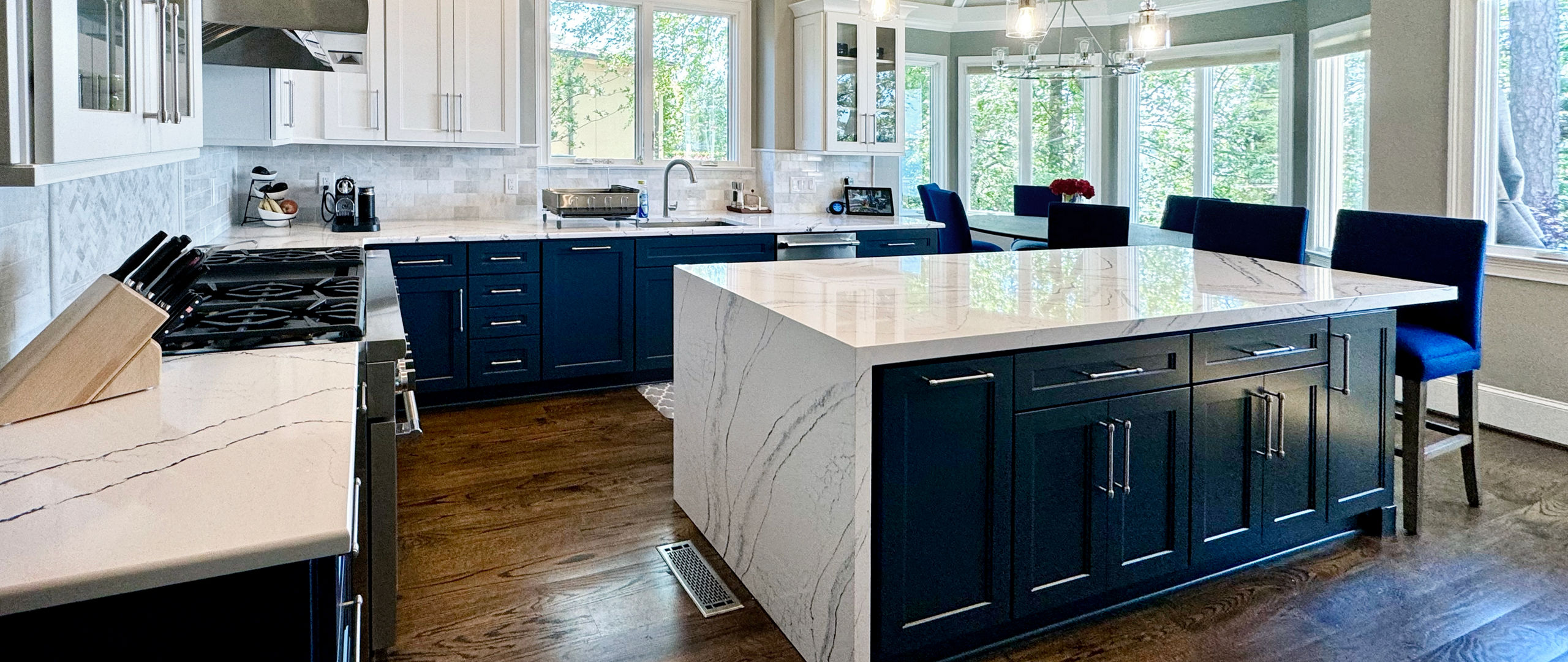 Lakefront Refresh: Kelli transformed a dark, dated kitchen into a bright and inviting centerpiece for a lakefront home. The navy and white cabinetry pairs with Cambria’s Portrush on the island with a mitered waterfall edge as well as on the surrounding countertops.