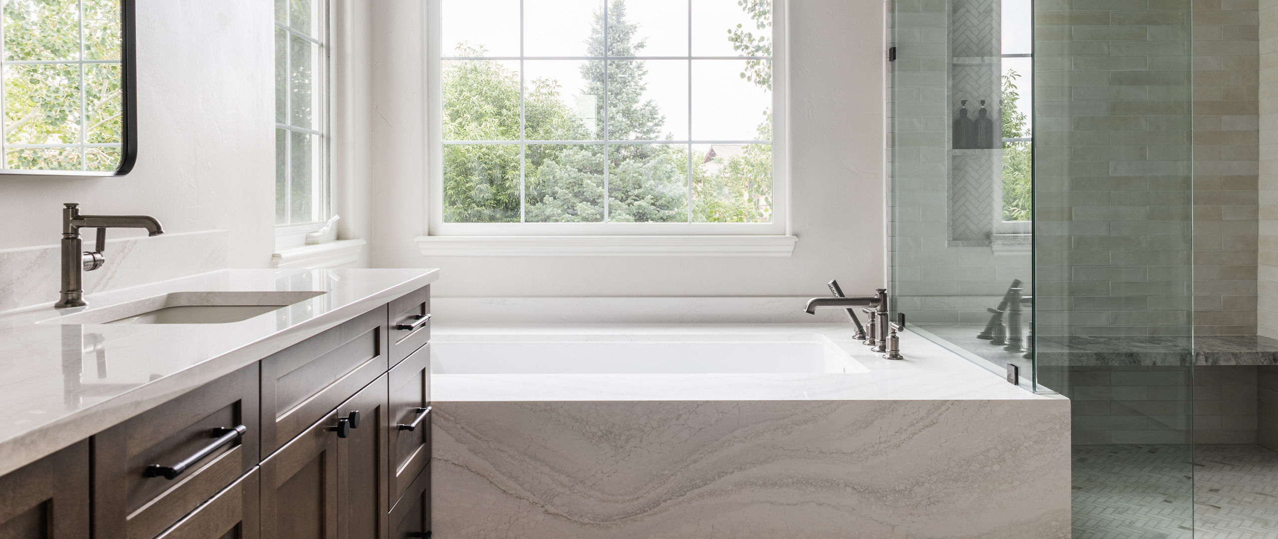 Primary Bath Showcase: In this full home remodel, it was the primary bath that shined. The centerpiece: a striking bathtub clad in Everleigh, finished with precise mitered edges that created clean corner details. The same material carried across the vanity tops, tying the entire space together in a cohesive, elevated design.