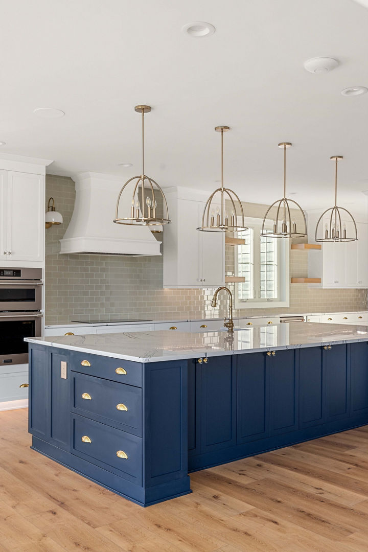 Clive Custom Home: This custom residence located in Clive, IA, features a light, airy palette. In the kitchen, Portrush® tops an oversized island and perimeter countertops. Its veining complements the navy cabinetry and golden finishes carried throughout the home, creating a cohesive color story.