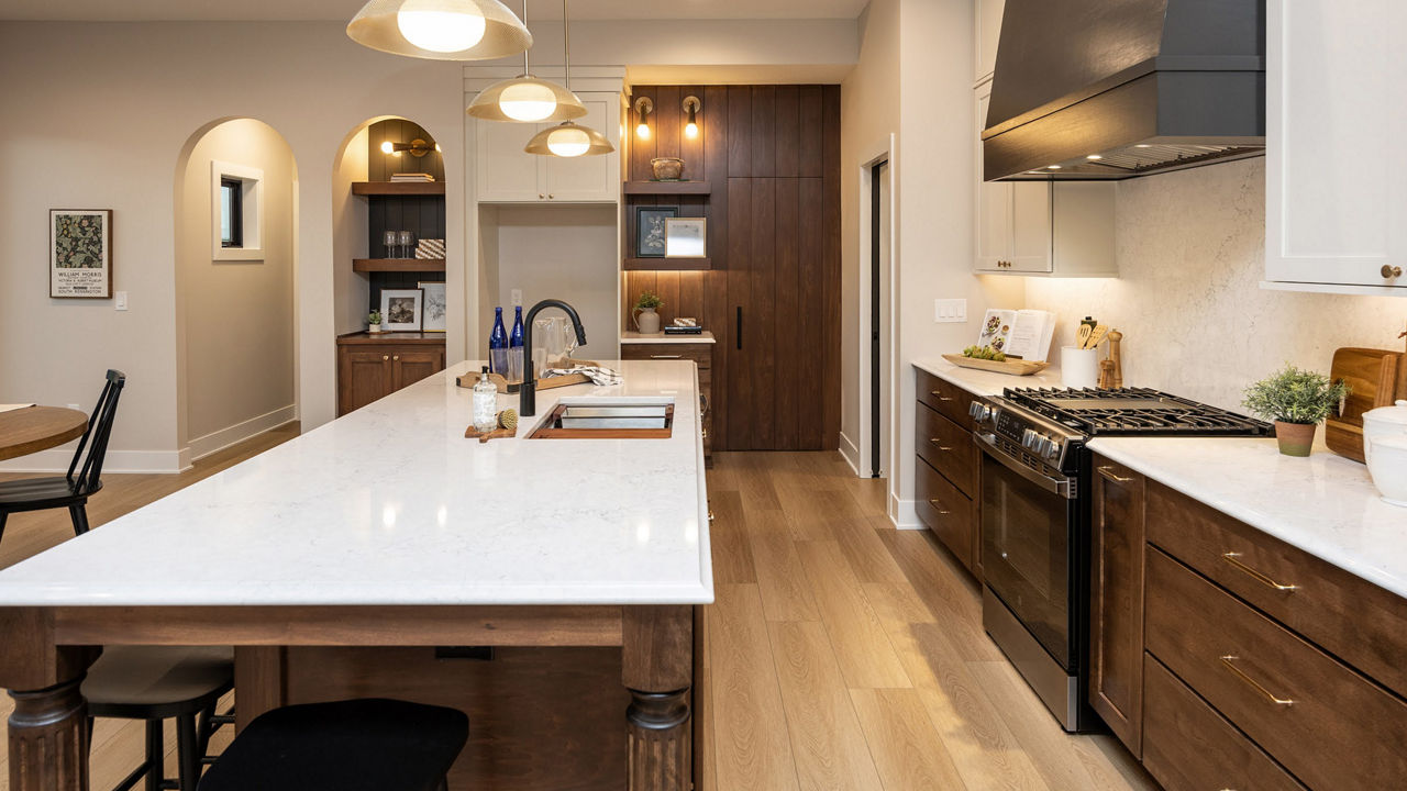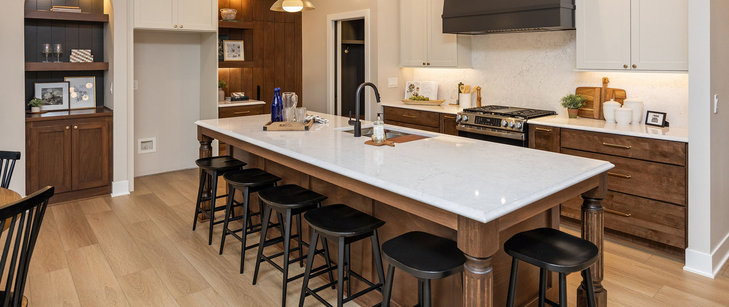 Haley Model Home: This model showcases Frampton Homes’ classic aesthetic and builder’s craft. The kitchen features Whitendale™ across a chiseled-edge island, perimeter countertops, and a full-height backsplash, beautifully contrasting with the rich wood cabinetry. The same design extends to the bathroom counters and unique bathtub surround. “The Whitendale design stands out as something special, yet remains timeless enough that you’ll never want to replace it,” Allie notes.