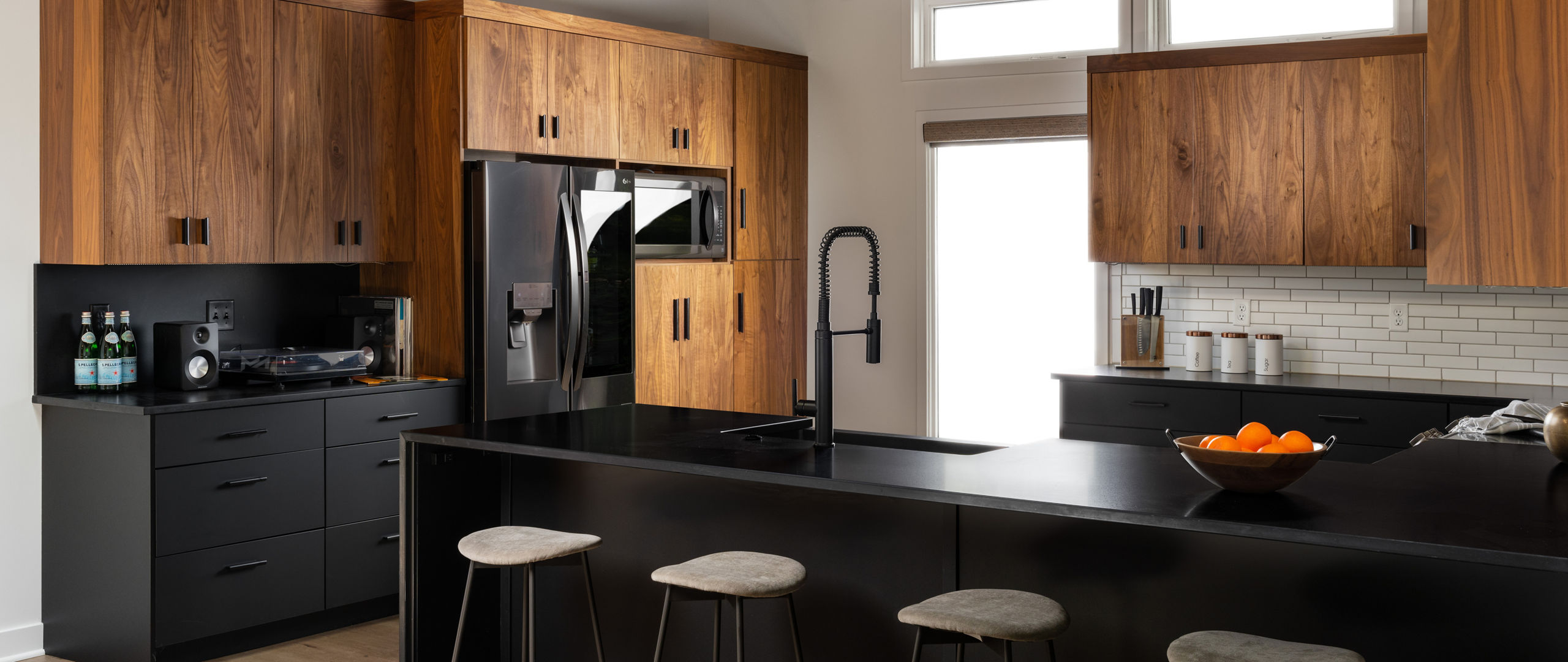 The Mid-Century: In a Kansas City mid-century home, Schloegel Design Remodel transformed a dated kitchen into a sleek, masculine space tailored to its owner’s lifestyle. The design features Cambria Black™ on the countertops, peninsula, and backsplash, paired with matte black and walnut cabinetry. The striking simplicity and clean lines make the space feel like “a work of art,” says Megan.