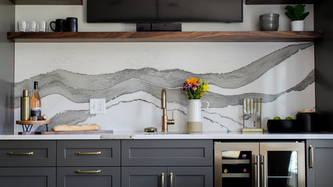 Nature Valley: In a Napa Valley–inspired lower level, her clients wanted a space that was durable enough for kids yet sophisticated enough for entertaining. Jordan delivered both, transforming the space with Cambria’s Skara Brae® on the bar’s countertop and full-height backsplash. The grout-free application created a sleek look and acted as “the artwork of the space,” she says.
