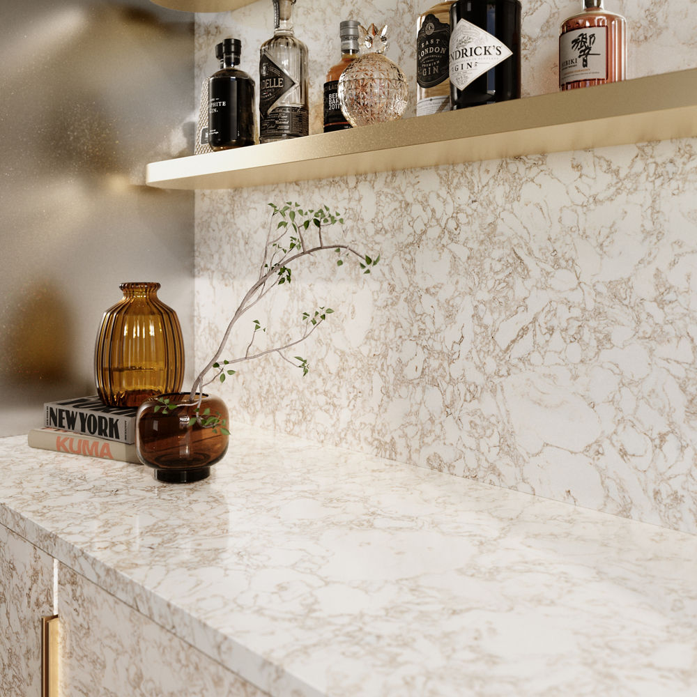 Quartz backsplashes showcase the quartz design like a piece of art. Whether you choose a subtle design or one with saturated contrasting tones, the continuity of a quartz backsplash brings elegance and cohesion to your space.