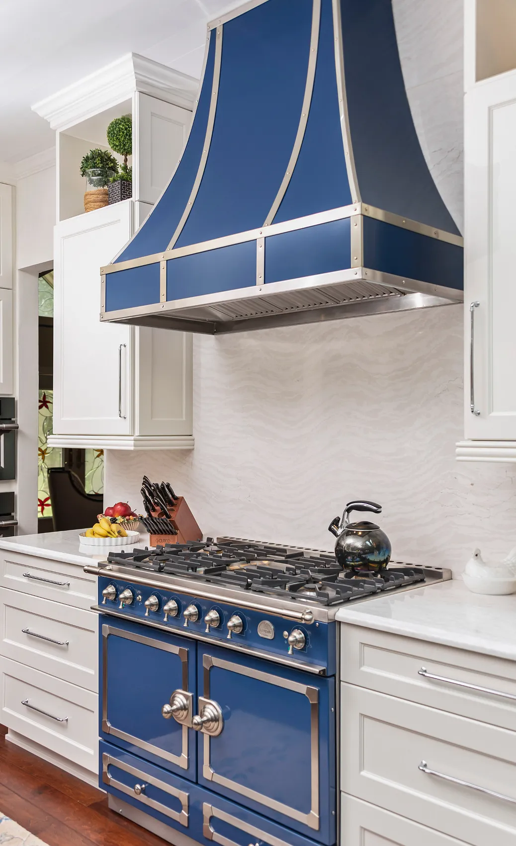 This dreamy blue kitchen features a custom Brittanicca Matte backsplash that slides to reveal hidden storage. Paired with a black and brass range hood, the marble-like quartz backsplash is both luxe and practical. See more blue kitchens with Cambria quartz surfaces.
