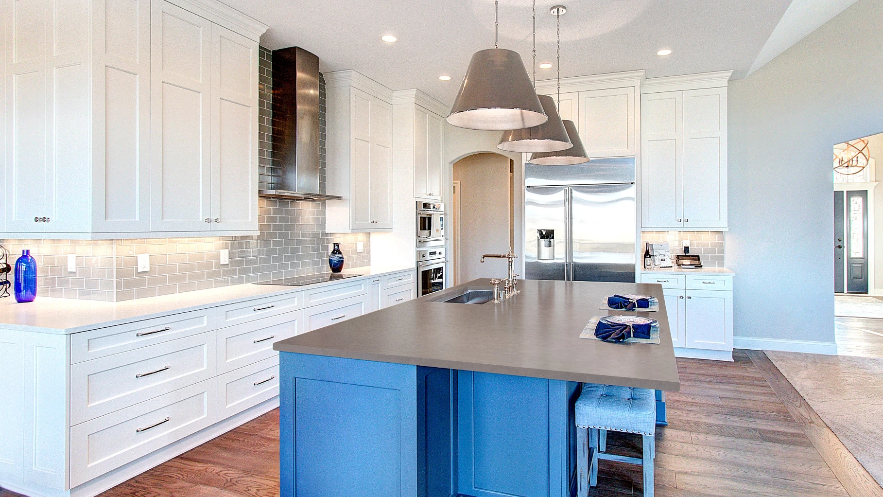 Many transitional kitchens feature gray countertops and a range of tones and textures, but this transitional kitchen embraces bold color with a blue and gray island featuring Carrick Matte countertops. A subdued white perimeter with Swanbridge Matte™ countertops keeps the island as the focal point.