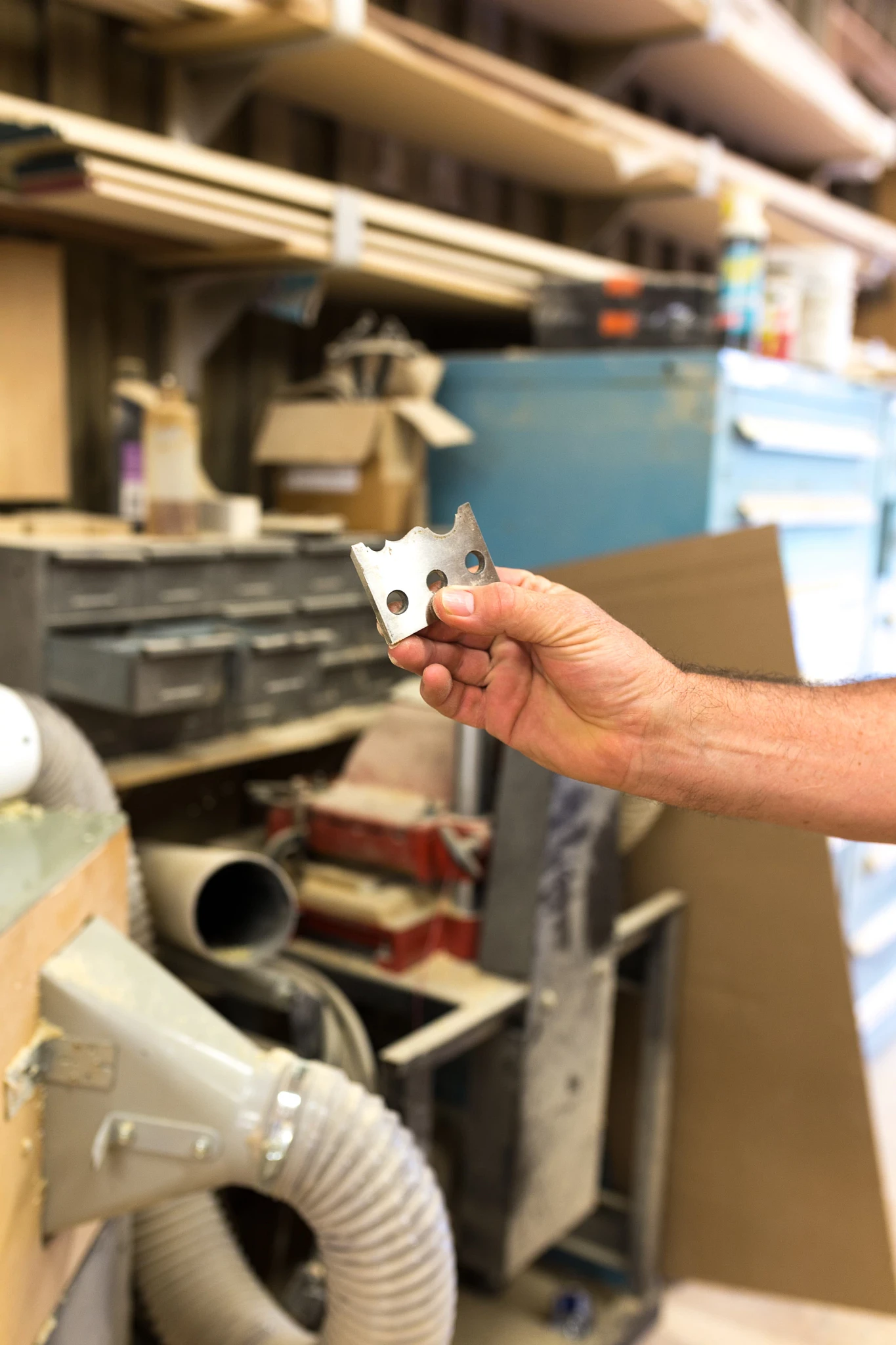 “If drop miters are not available, then use the overall drawing dimensions of the surface piece,” says Cory. “Create a seam in the middle of the bottom piece to get around the stump or build the bottom piece under the substrate to keep it in one piece. Measure the setback on the three closest sides of the stump. Offset out 1/8″ to make your cut line. If cutting by hand, ensure personal protective equipment is worn.”