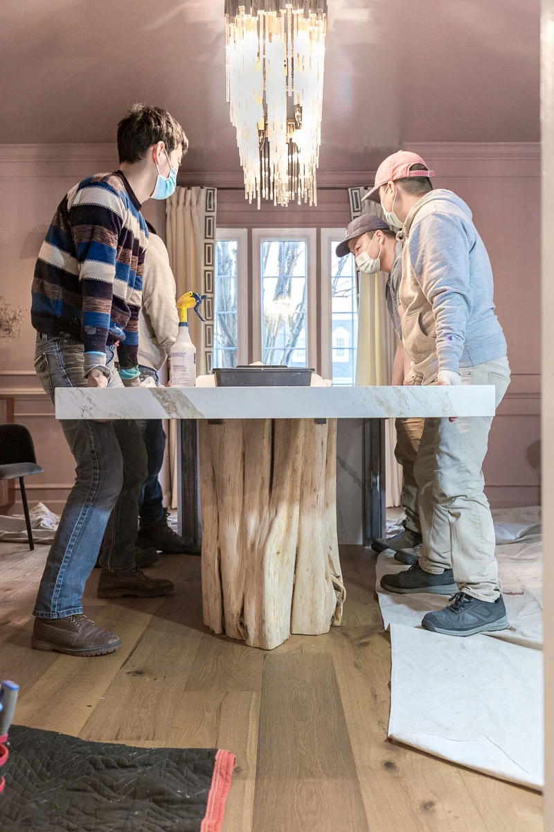 Going into the makeover, Jewel knew she wanted to use a natural and organic element as the showstopping component of the room. She and the client landed on what Jewel describes as “a tree trunk with a marble-alternative waterfall table” as the winning concept.