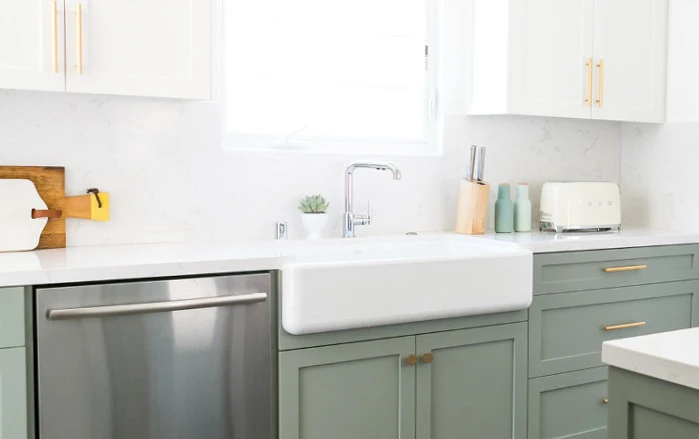 a kitchen with light green lower cabinets, white upper cabinets, both with gold handles, a farmhouse sink with silver faucet, and miscellaneous kitchen appliances and supplies sitting on the counters.