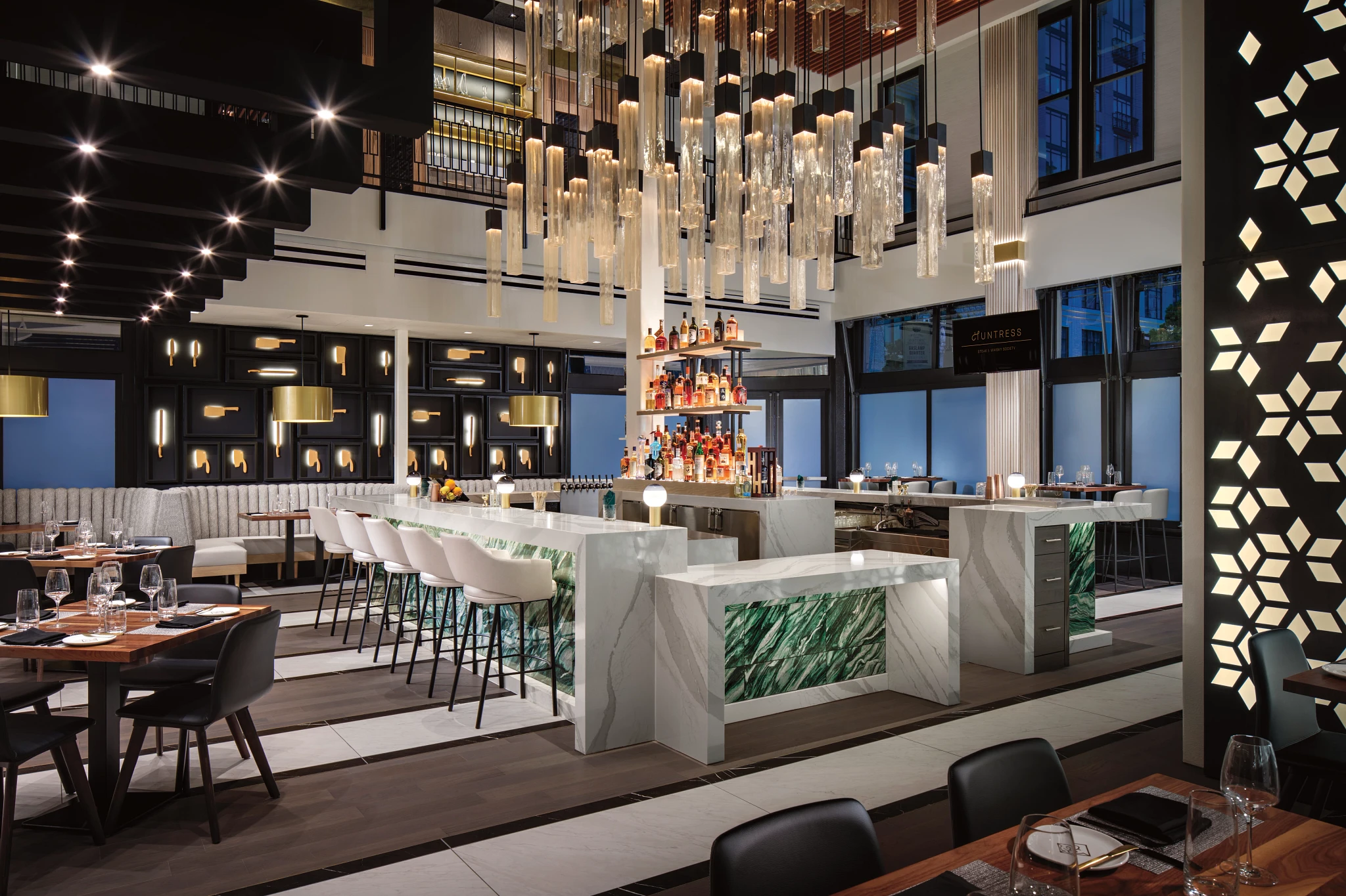 After spending an active day amid the natural beauty of sunny San Diego, the quiet luxury of Huntress may come as a welcome respite. Your experience begins with a feast for the eyes: a highly architectural space in black and white, accented with hints of gleaming gold and a tongue-in-cheek wall of framed butcher’s knives. Overhead, spectacular oversized pendants set the surroundings aglow. But the real spotlight is on the menu, an eclectic mix of creative offerings like Lobster Curry Soup, Miso Chilean Sea Bass, or—the main event—a center-cut A5 steak from Japan’s Satsuma Kagoshima Prefecture, where some of the world’s highest-quality (and most expensive) Wagyu beef is sourced. The drinks selection is just as special. Head to the centerpiece bar—wrapped in Cambria’s Brittanicca—to enjoy a selection from the Huntress Whiskey Program, which offers guests an exclusive taste of rare, vintage, and unique Japanese whiskies.