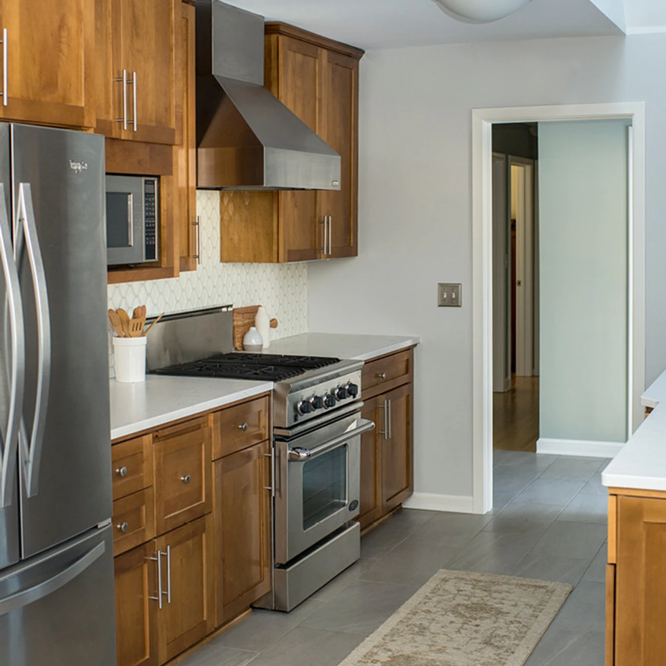 Incorporating darker elements into a compact kitchen can make the space seem smaller, which is why it isn’t always practical to match your countertop tone to that of the cabinetry. This galley kitchen features low-sheen Swanbridge™ in a matte finish tops paired with glass tile backsplash and light paint to keep things bright. The wood kitchen cabinets and quartz countertop offer contrast and organic texture to complete the look. Upgrading the countertops in a compact kitchen or galley kitchen is a small but impactful change that can help the space feel larger as well as more functional.
