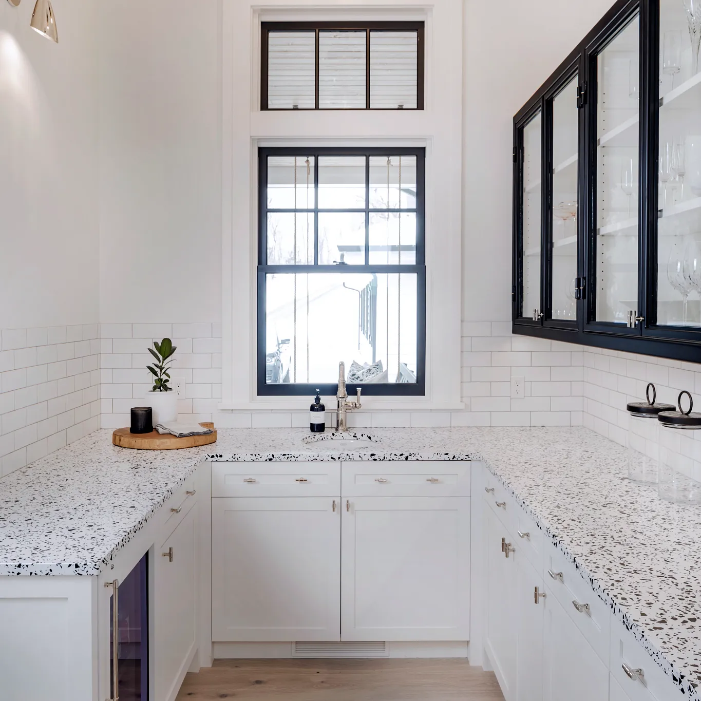 In the home’s second pantry, Gladstone quartz countertops pair well with black cabinetry and window trim.