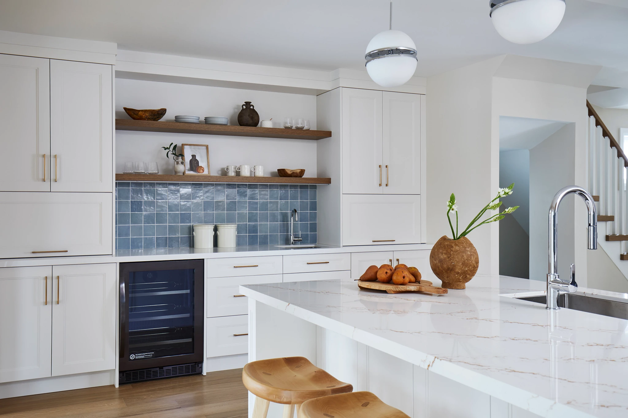 Other modern elements in this kitchen update include white oak hardwood floors throughout for a sense of space and flow. White painted custom cabinetry built by Distinctive by Design and stained wood open shelving near the beverage station add to the feeling of openness. Trendy Zellige tile—a variety of glazed terracotta often from Morocco—provides a bit of a weathered vibe and a pop of color. A wood wrapped range hood and wooden counter stools add a touch of relaxed organic comfort and complement the wood flooring. And the addition of that beverage station adds additional kitchen prep space and appliance garages to keep otherwise unsightly countertop clutter out of sight. The outcome of this remodel is a more spacious, beautiful, functional, and modern kitchen that’s inviting to anyone who loves cooking, entertaining, or just hanging out.