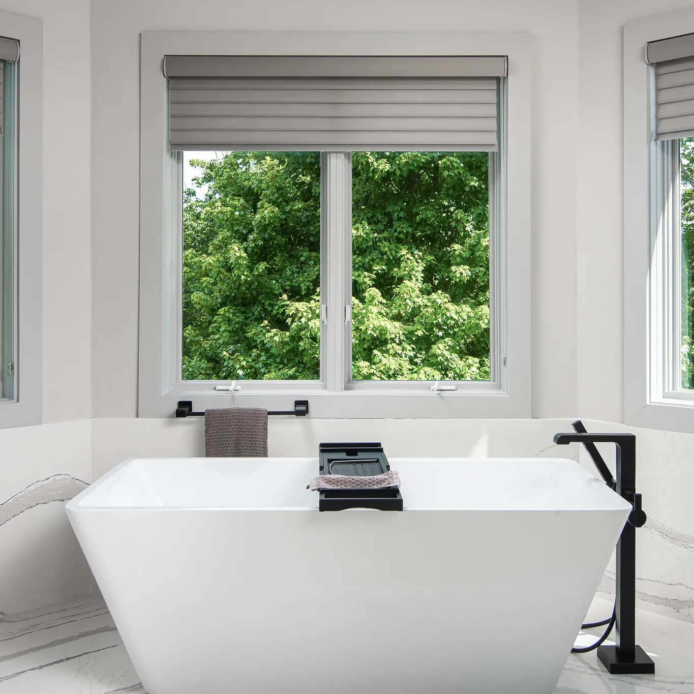 A bathroom featuring Cambria Brittanicca quartz flooring and siding beside a bathtub and window.